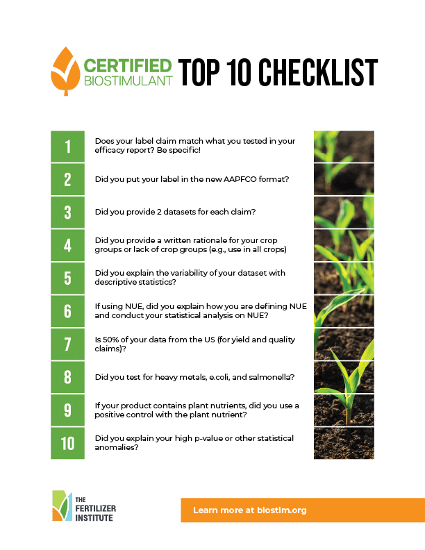 Certified Biostimulant is a voluntary program that certifies that information to support label claims of a biostimulant product conforms to the United States Biostimulant Industry Guidelines to Support the Safety, Composition and Efficacy of Plant Biostimulant Products. It provides a consistent framework for reporting a minimal dataset on safety, composition, and efficacy tests conducted on the product. The program assures the existence of such data without disclosing the results. The program certifies that proper experimental protocols were used to test efficacy, without making any assertion on the efficacy of the product for any claims made.